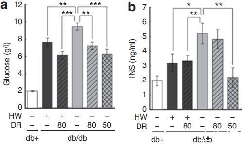 圖5、氫的作用與飲食限制的作用相似。Db/db小鼠被給予含或不含氫的水(HW)并接受飲食限制(DR)。對照組在整個實驗期間允許自由獲取食物和水。在飲食限制組中,小鼠允許自由飲水,但食物攝入量被限制為自由飲食消耗量的80%或50%。治療3個月后測量血漿(a)葡萄糖、(b)胰島素(INS)和(c)甘油三酯(TG)的濃度。