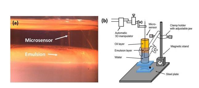 油水界面的化學微剖面。油水混合物中微電極性能驗證。除微乳液外,乳液在熱力學上是不穩定的,只會作為分散體保持有限的時間。理解油/水(或水/油)界面對乳液形成和穩定性的作用在近年已得到充分研究;然而,跨界面的組分相互作用仍有待探索。本研究使用針型微電極來表征各種模擬艙底水乳液下油和水之間的原位界面反應。由于這是首次將電化學傳感器應用于油水混合物,使用眾所周知的DO微電極進行了測試,以驗證電化學微電極在油水混合物中的性能,在不同DO條件下,DO剖面清晰地顯示了DO從油相(21%)向含有除氧劑的水相(0%)的擴散。微電極性能驗證的詳細信息見支持信息(圖S9)。