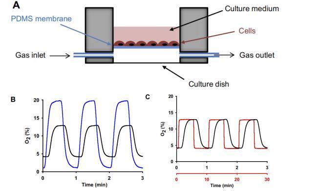 圖1細(xì)胞暴露于恒定或可變氧氣濃度的體外實(shí)驗(yàn)系統(tǒng)。A:對培養(yǎng)細(xì)胞進(jìn)行受控間歇性缺氧(IH)的細(xì)胞培養(yǎng)設(shè)置示意圖(解釋見正文)。B:以60次/小時的頻率進(jìn)行不同量級的IH(20-1%O2(藍(lán)線)和13-4%O2(黑線))時,在膜頂部(細(xì)胞培養(yǎng)層)測得的實(shí)際氧氣濃度。C:以60次/小時(黑線)和6次/小時(紅線)的頻率施加13-4%O2的IH時,在膜頂部(細(xì)胞培養(yǎng)層)測得的實(shí)際氧氣濃度。每個時間軸的顏色與相應(yīng)的線相關(guān)聯(lián)。B和C中的信號在時間上有所偏移,以便于視覺比較。