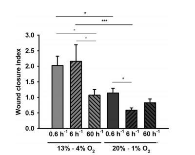 圖3恒定氧氣濃度下的內皮傷口閉合指數。與作為對照的13%氧氣相比,細胞暴露于4%氧氣時傷口愈合率明顯增加。