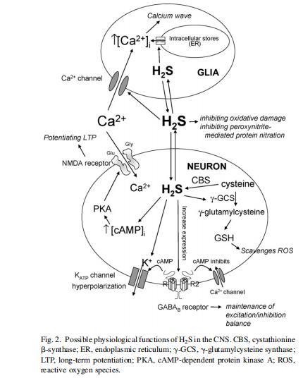 最近還顯示,H?S上調γ-氨基丁酸(GABA)B受體(GABABR),這是一種位于突觸前和突觸后位點的G蛋白偶聯受體(Han et al.,2005)。刺激突觸后受體產生長時程抑制性突觸后電位,導致K?電導增加,對抑制性神經傳遞的微調很重要。H?S已顯示通過增加K?外流(可能通過ATP依賴性K?(KATP)通道)使CA1區和中縫背核神經元超極化(Reiffenstein et al.,1992)。在突觸前位點,GABABR通過抑制電壓敏感性Ca2?通道調節神經遞質(如GABA和Glu)釋放。H?S上調GABABR表達暗示H?S可能在維持腦內興奮/抑制平衡中起作用。