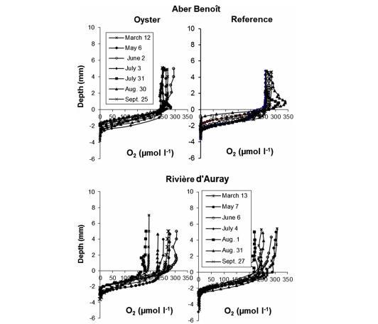 底層水O?濃度在阿伯貝努瓦河牡蠣點下方為235–300 μmol l?1(圖6),參考點為255–285 μmol l?1,最高達340 μmol l?1(沉積物上方0.8 cm)。奧雷河牡蠣點下方為165–305 μmol l?1,參考點為200–320 μmol l?1。O?剖面均呈負濃度梯度,表明沉積物是O?的匯。O?在沉積物-水界面下數毫米內耗盡,穿透深度: