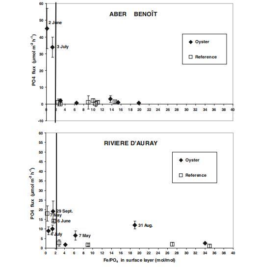 硫化物通量在阿伯貝努瓦河牡蠣點下方5月、7月、8月顯著增加(達510 μmol m?2 h?1),參考點近零。奧雷河牡蠣點通常較高(達50 μmol m?2 h?1),但5月、9月參考點更高(148、96 μmol m?2 h?1)。