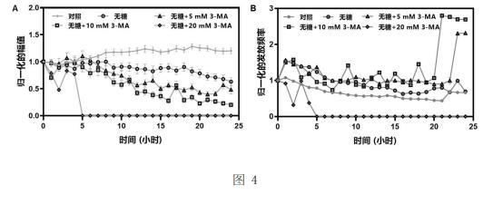 圖4是本發(fā)明實(shí)施例中葡萄糖剝奪同時(shí)抑制細(xì)胞自噬的心肌細(xì)胞電生理信號特征參數(shù)統(tǒng)計(jì)圖;其中,圖4中的(A)為24小時(shí)連續(xù)監(jiān)測細(xì)胞自噬抑制劑3-甲基腺嘌呤(3-MA)處理葡萄糖饑餓心肌細(xì)胞的歸一化幅值變化曲線圖;圖4中的(B)為葡萄糖饑餓條件下3-MA對心肌細(xì)胞發(fā)放頻率的影響曲線圖。