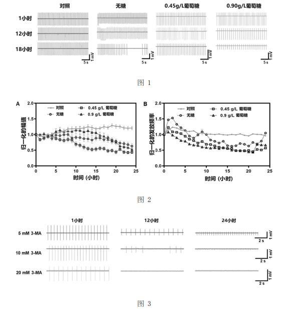 本發(fā)明的有益效果:本發(fā)明利用心肌細(xì)胞自發(fā)放電的生理特性,結(jié)合微電極陣列芯片,通過簡單、高效的方法實(shí)時(shí)快速地記錄葡萄糖剝奪條件下心肌細(xì)胞的電生理變化,實(shí)現(xiàn)對細(xì)胞能量應(yīng)激狀態(tài)的檢測評價(jià),且為理解低血糖對心臟的影響提供了新的工具,對糖尿病和低血糖癥的藥物篩選和臨床研究具有重要價(jià)值。