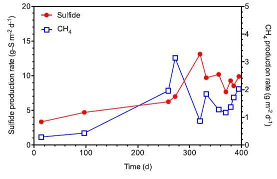 圖2、通過批量試驗確定實驗室內污水底泥中硫化物和甲烷產率的變化培養階段。