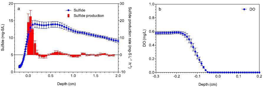 圖3、模擬穩態沉積物中總溶解硫化物和硫化物產量狀態;(b):在沉積物表面附近作剖面濃度分布圖。沉積物表面深度為0 cm。圖中所示的濃度剖面圖是第396天測量的6個剖面圖的平均值,誤差條顯示標準差。