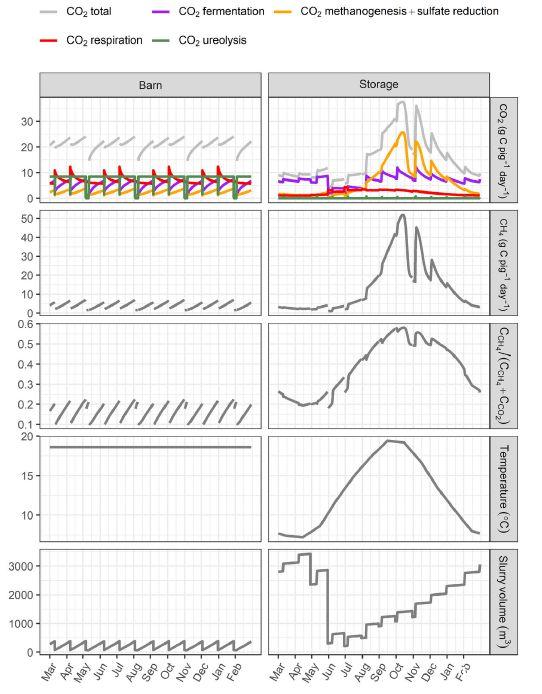 圖5、使用參數集v2.0的厭氧生物降解模型(ABM)模擬丹麥豬舍和室外糞便儲存的CO2源和CH4排放。排放的中斷或短期下降與從渠道(谷倉)和儲罐(儲存)中去除泥漿有關。