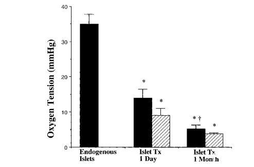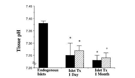 體重和血糖濃度。所有血糖正常的供體和受體在進(jìn)行胰島移植時(shí)的體重均為325克(表1)。因注射STZ而患糖尿病的動(dòng)物體重也是325克,但直到3-4天后進(jìn)行胰島移植時(shí),它們的體重下降了10%。移植后,血糖正常的動(dòng)物體重緩慢增加,而糖尿病動(dòng)物在移植后第一周體重下降,此后體重穩(wěn)定在移植前體重的80%。所有非糖尿病動(dòng)物的血糖濃度均為4-6毫摩爾/升。所有經(jīng)STZ處理的動(dòng)物在進(jìn)行組織pH和Po2測(cè)量時(shí)仍有糖尿病。