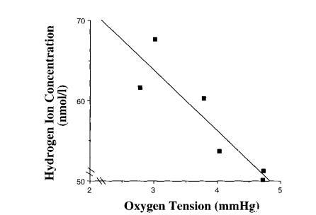 內(nèi)源性胰島的平均Po2為35mmHg(圖3)。移植后1天和1個(gè)月時(shí),移植胰島的組織Po2明顯低于內(nèi)源性胰島。非糖尿病受者和糖尿病受者的胰島移植物在兩個(gè)時(shí)間點(diǎn)的Po2差異均無(wú)統(tǒng)計(jì)學(xué)意義。非糖尿病受者胰島移植物組織Po2的下降在移植后1天和1個(gè)月之間加劇。然而,糖尿病受者中卻看不到這種差異。移植物不同位置的Po2沒(méi)有差異(數(shù)據(jù)未顯示)。在胰腺外分泌實(shí)質(zhì)中,平均組織Po2為25-30mmHg(圖4)。非糖尿病動(dòng)物和糖尿病動(dòng)物腎皮質(zhì)中的Po2均為20mmHg。糖尿病動(dòng)物1個(gè)月大的胰島移植組織Po2與氫離子濃度之間存在統(tǒng)計(jì)學(xué)意義上的顯著負(fù)相關(guān)(圖5),但在其他實(shí)驗(yàn)組中看不到這種情況。