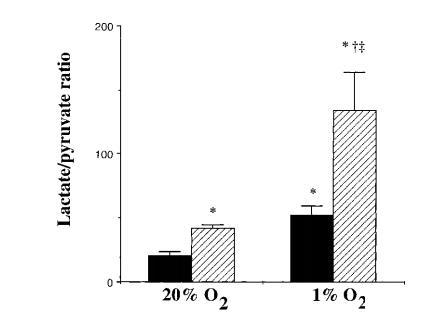乳酸-丙酮酸比率。當(dāng)暴露于標(biāo)準(zhǔn)培養(yǎng)條件(95%空氣-5%二氧化碳)時(shí),從胰島移植物中提取的胰島培養(yǎng)基中的乳酸-丙酮酸(乳酸/丙酮酸)比率與新鮮分離的對(duì)照胰島培養(yǎng)基中的乳酸/丙酮酸比率相比有所增加(圖6)。從暴露于95%空氣-5%CO2的取回的小胰島培養(yǎng)基中獲得的乳酸/丙酮酸比率反而與從暴露于缺氧(1%O2)的新鮮分離對(duì)照小胰島培養(yǎng)基中獲得的乳酸/丙酮酸比率相似。與所有其他組別相比,從胰島移植中提取并暴露于缺氧環(huán)境的胰島在培養(yǎng)基中的乳酸/丙酮酸比率明顯增加。