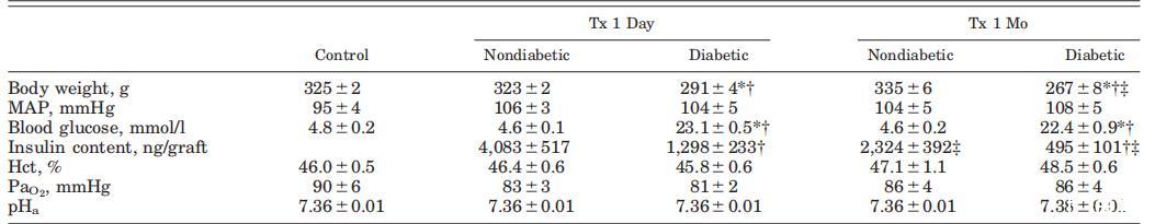 移植物胰島素含量。糖尿病動(dòng)物的胰島移植物在移植后1天和1個(gè)月的胰島素含量均低于非糖尿病受體的移植物(表1)。所有胰島移植物(即非糖尿病受體和糖尿病受體的移植物)的胰島素含量在移植后1天至1個(gè)月期間均有所下降。