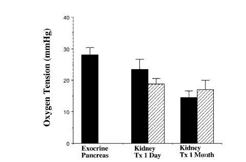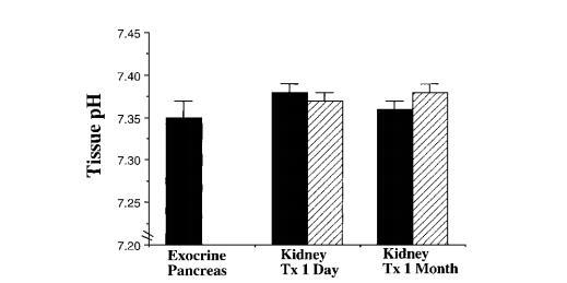 組織pH和Po2。在內(nèi)源性胰島中,組織的平均pH值與動(dòng)脈血中的pH值相似(圖1)。移植胰島的組織pH值明顯較低。在非糖尿病動(dòng)物和糖尿病動(dòng)物的胰島移植中,以及在移植后1天或1個(gè)月進(jìn)行調(diào)查時(shí),都記錄到了相似的pH值。移植物不同位置的pH值沒(méi)有差異(數(shù)據(jù)未顯示)。植入胰島移植物附近的外分泌胰腺和腎皮質(zhì)的組織pH值(圖2)與內(nèi)源性胰島和動(dòng)脈血的pH值相似。