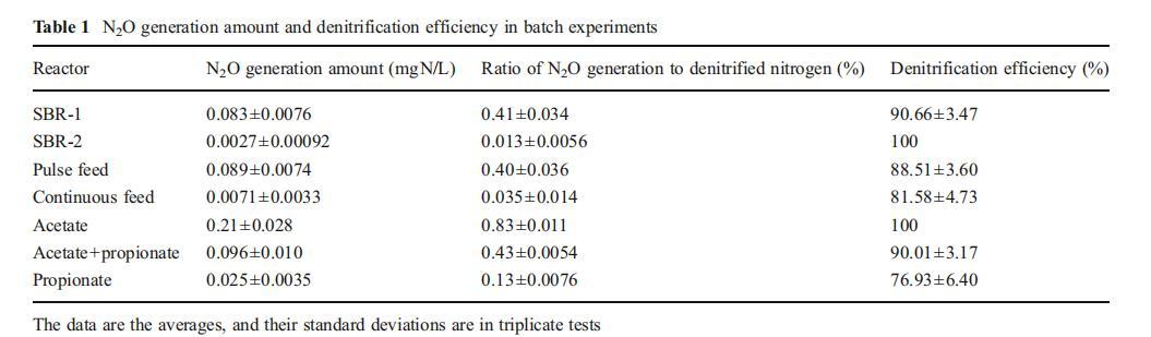 SBR-1中,N?O主要在缺氧階段生成,厭氧階段幾乎未檢測到;KNO?溶液投加后,溶解態N?O-N濃度在前15分鐘迅速升至0.87 mg/L,隨后急劇降至接近零(圖2)。類似地,SBR-2缺氧初期也觀察到N?O瞬時積累(圖3),但其最高溶解態N?O濃度僅0.08 mg/L,遠低于SBR-1。此外,尾氣N?O也被測定,氣相和液相總N?O生成量見表1。可見SBR-1的N?O生成量(占TN去除量的0.41±0.034%)雖顯著高于SBR-2(0.013±0.0056%),但遠低于先前反硝化除磷系統的報道值(2.34–21.6%)(Wang et al.2011a,b)。這可能歸因于使用了丙酸鹽與乙酸鹽的混合碳源,而非單一乙酸鹽。相較于乙酸鹽,丙酸鹽作為碳源顯著降低了廢水處理過程的N?O生成(Zhu and Chen 2011)。