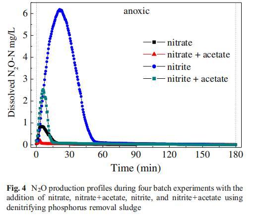 因此,連續投加硝酸鹽或使用丙酸鹽為碳源均可減少反硝化除磷過程的N?O生成。此外,減少厭氧時間、使用污泥堿性發酵液及添加銅離子(Cu2?)等措施也有報道可降低生物脫氮除磷過程的N?O生成(Wang et al.2011b;Zhu and Chen 2011;Zhu et al.2012),其在反硝化除磷工藝中的適用性值得深入研究。