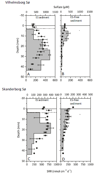 圖3、Vilhelmsborg S?(a,b)和Skanderborg S?(c,d)的ES沉積物和無ES沉積物中的硫酸鹽還原率(灰色條)和硫酸鹽濃度(黑點)。誤差線表示平均值的標準誤差(n=3)。a和c中的虛線表示含氧區的下邊界。