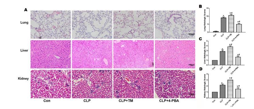 圖5:4-PBA和TM對敗血癥小鼠重要器官病理損傷的影響。給小鼠腹腔注射4-PBA和TM后,在CLP12小時后收集肺、肝和腎樣本。通過蘇木精和伊紅(H&E)染色檢測肺、肝和腎的病理變化(A,放大100倍)。計算損傷評分水平(B、C和D)。