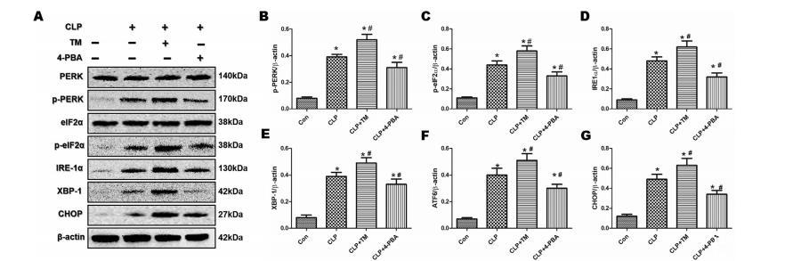 圖3:4-苯基丁酸(PBA)和TM對敗血癥小鼠肺內質網應激途徑的影響。在CLP前給小鼠腹腔注射4-苯基丁酸(40毫克/千克),CLP12小時后收集肺部樣本。通過Western印跡檢測總PERK(A)和eIF2α(A)、p-PERK(A和B)和peIF2α(A和C)、CHOP(A和G)、ATF(A和F)、IRE1α(A和D)和XBP1(A和E)蛋白的表達。