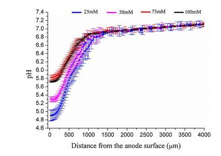 圖6.緩沖濃度(25 mM、50 mM、75 mM和100 mM)對Geobacter生物膜內(nèi)pH分布的影響。誤差線表示標(biāo)準(zhǔn)偏差。