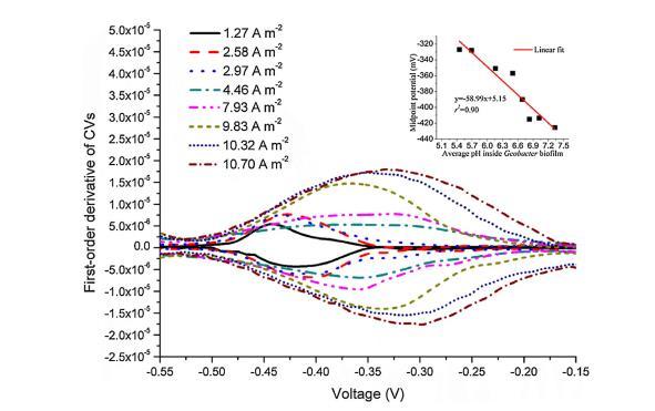 圖5.CV的一階導(dǎo)數(shù)圖(di/dV),插圖顯示了Geobacter生物膜內(nèi)平均pH水平變化的中點(diǎn)電位。