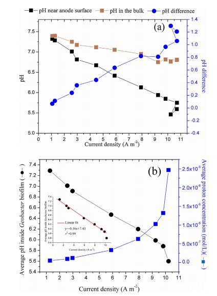 圖4.陽極表面附近和批量溶液中的pH變化以及作為電流密度函數(shù)的pH差異(a)。Geobacter生物膜內(nèi)平均pH變化曲線及各種電流密度下相應(yīng)的質(zhì)子濃度曲線,插圖顯示了電流密度和平均pH值之間的線性相關(guān)性(r2=0.99)(b)。