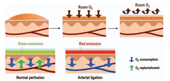 使用配備藍光閃光燈的定制相機照亮并捕捉傳感繃帶的發射。參比染料發射的綠色通道圖像是用510/10nm濾光片拍攝的。紅色通道圖像使用700/70nm濾光片捕獲,相機延遲時間設置為消除皮膚自發熒光背景。通過繪制紅通道和綠通道圖像之間的強度比來構建比率圖,并通過對比率圖進行強度校準來獲得組織氧合圖。