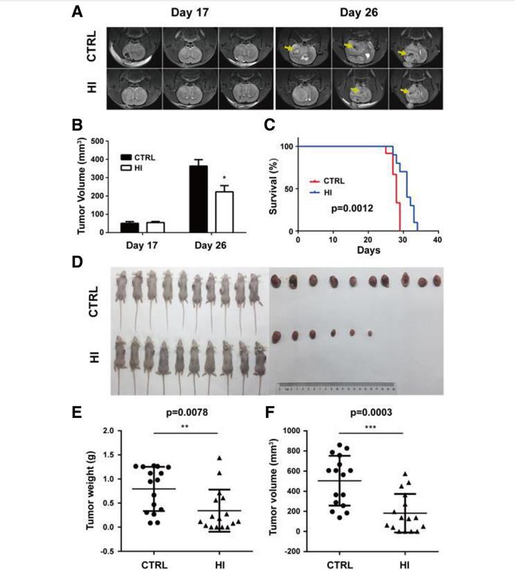 圖1:氫氣吸入還能抑制U87皮下小鼠模型的腫瘤生長(d),腫瘤重量(e)和腫瘤體積(f)均有所下降。CTRL:對照組;HI:氫氣吸入組