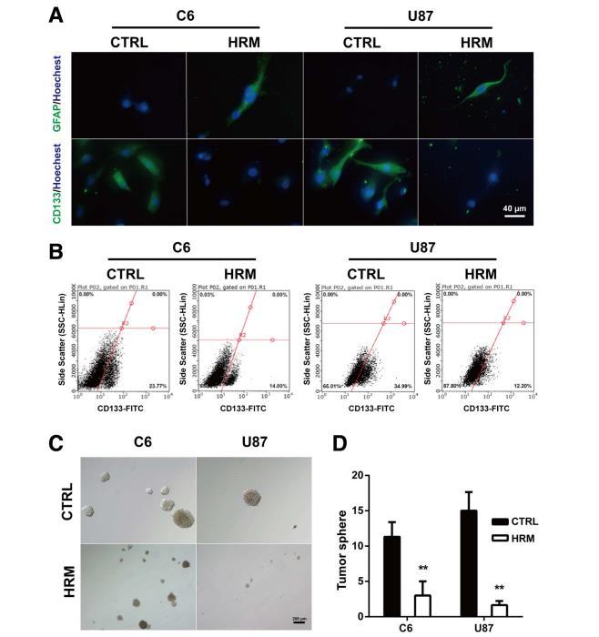 圖3:處理減弱了膠質瘤細胞的干性。氫處理后,用免疫熒光染色法評估膠質瘤細胞中GFAP和CD133的表達水平(a)。氫氣處理后,CD133陽性細胞的數量用流式細胞儀測定(b)。膠質瘤細胞的癌干細胞自我更新能力是通過球形成試驗確定的。拍攝的代表性圖像(c)和量化(d)。GFAP,神經膠質纖維酸性蛋白;CTRL,對照組;HRM,富氫培養基。