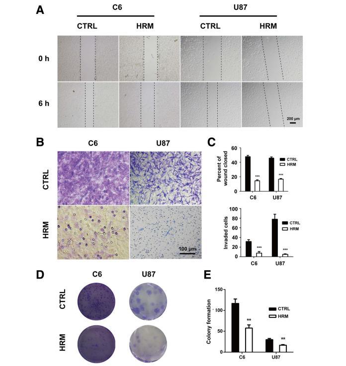 圖5氫處理抑制了C6和U87細胞的遷移、侵襲和集落形成能力。氫氣處理后使用傷口愈合試驗檢測細胞遷移能力(a)。氫氣處理后,使用Matrigel侵襲試驗測定細胞的侵襲能力(b)。遷移和侵襲試驗的定量代表三個獨立實驗(c)。氫氣處理后使用集落形成試驗評估集落形成能力(d)。菌落形成檢測的定量代表三個獨立實驗(e)。