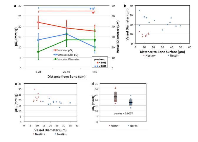 (a)血管平均直徑(綠線,4只小鼠的38根血管)、血管內(紅線,4只小鼠的38根血管)和血管外(藍線,3只小鼠的39個位置)pO2與骨表面到測量位置的距離呈函數關系。誤差為±標準偏差。(b)nestin+血管(紅色圓圈,n=9根血管,來自3只小鼠)和nestin-血管(藍色正方形,n=12根血管,來自3只小鼠)的直徑與骨內膜表面距離的函數關系圖。(c)同樣的nestin+血管和nestin-血管的pO2與血管直徑的函數關系圖。(d)nestin+(紅色圓圈,n=17根血管,來自7只小鼠)和nestin-(藍色方框,n=16根血管,來自5只小鼠)血管的pO2。顯示每組數據的平均值(黑線)和±標準偏差(陰影框)。