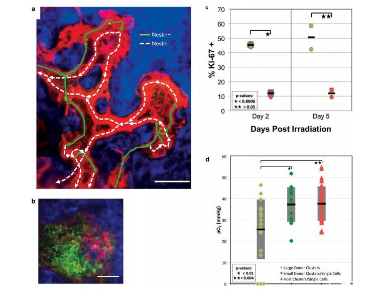 (a)nestin-GFP小鼠的血管連接圖顯示,nestin+血管位于竇道的上游并向竇道排水。表示血流方向的箭頭是通過視頻速率成像跟蹤標記的RBC的移動確定的,并疊加在BM血管的最大強度投影圖上(紅色=血管染料,綠色=nestinGFP/RBC,藍色=SHG骨信號)。綠色實線表示血管與鄰近的nestin+細胞,白色虛線表示nestin-血管。縮放條~100μm。(b)一個通用DsRed受體的骨髓在移植了來自通用GFP供體的2,500萬個骨髓細胞5天后的體內圖像。紅色=DsRed,綠色=GFP,藍色=骨的SHG??s放條~100μm。(c)移植后第2天(n=3只小鼠)和第5天(n=2只小鼠),通過FACS對綠色(供體)和紅色(宿主)骨髓細胞進行Ki-67染色。每個符號代表不同的小鼠??潭染€(第2天)為平均值的±標準偏差。(d)與小的供體細胞群/單細胞(4只小鼠,n=16個位置)和宿主細胞群/單細胞(5只小鼠,n=40個位置)相比,大的供體細胞群(4只小鼠,n=19個位置)區域的體內pO2值。圖中顯示了每組數據的平均值(黑線)和±標準偏差(陰影框)。