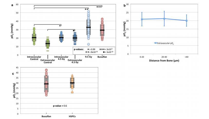 (a)亞致死(4.5Gy,n=5只小鼠的13個血管和29個血管外位置)或致死(9.5Gy,n=2只小鼠的40個位置)伽馬輻照兩天后,或丁胺(35mg/kg,n=6只小鼠的40個位置)調理兩天后的BM pO2。圖1d中未經處理的對照組pO2與之比較。(b)血管外pO2測量值與4.5Gy照射2天后測量位置到骨表面距離的函數關系圖(n=44個位置,來自4只小鼠)。(c)HSPC歸巢部位的pO2與丁胺苯磺吡啶治療受體的整體BM pO2的比較(n=17個HSPC,來自6只小鼠)。未觀察到有統計學意義的差異。在(a)和(c)中,顯示了每組數據的平均值(黑線)和±標準偏差(陰影框)。
