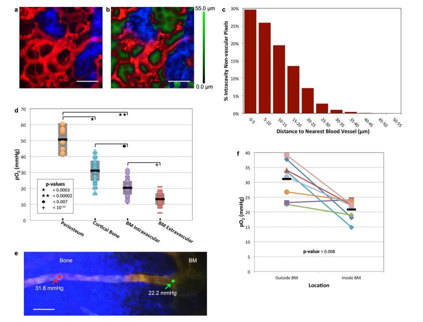 (a)小鼠腓腸肌的可見光內最大強度圖像(約75μm厚),顯示血管(紅色,Qtracker655血管染料)和骨(藍色,膠原SHG)。(b)三維虛擬成像堆棧的相應單個平面,顯示血管(紅色)、骨SHG(藍色)以及BM中每個血管外像素到最近血管壁的三維歐氏距離測量值(EDM,綠色)。(c)全三維成像堆棧中所有EDM的直方圖。(d)與骨膜和皮質骨血管中的pO2相比,骨髓中的pO2明顯較低。每個點代表一個單獨血管或間隙位置的pO2測量值(8只小鼠的骨膜、皮質骨、BM血管內和BM血管外的血管/位置分別為8、21、55和40個)。圖中顯示了每組數據的平均值(黑線)和±標準偏差(陰影框)。(e)血管從骨骼進入BM的最大強度投影圖像。骨骼(藍色)和血管(黃色)分別用SHG和RhodamineB-dextran/PtPC343熒光勾勒。兩個箭頭分別指向血管進入BM前后測量pO2的位置。(f)追蹤進入BM的單個血管時pO2的下降(n=4只小鼠的8根血管)。顯示的是每組數據的平均值(黑線)??潭染€~100μm。