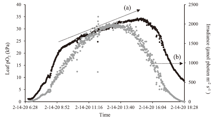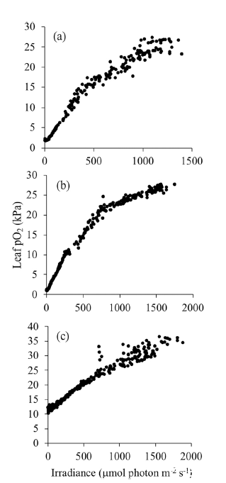 圖3、葉片內pO?隨光照變化的二相動態(示例)。葉片內pO?(黑色)與光合有效輻射(灰色)隨時間變化。(a)2019-09-11;(b)2020-02-14;(c)2020-05-07。顯示日出后快速上升至28–36 kPa,之后隨光強增加緩慢上升。