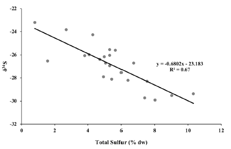 圖2、完整T.testudinum草甸中,根組織的δ3?S與總硫含量(TS)之間的線性關系(R2=0.67)。