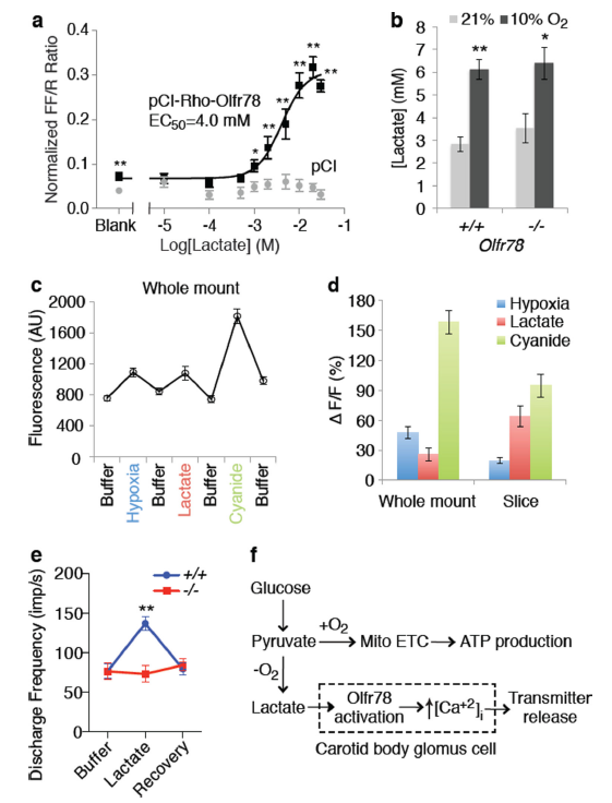 圖4、乳酸激活Olfr78并刺激頸動脈體感覺活動。a.在HEK293T中利用雙報告基因檢測乳酸對Olfr78的激活(空載體灰線,Olfr78黑線)。b.麻醉小鼠缺氧3 min后的動脈血乳酸水平。c,d.GCaMP3標(biāo)記球細(xì)胞在缺氧、乳酸(30 mM)、氰化物(2 mM)刺激下的鈣反應(yīng)。e.野生型與Olfr78-/-CB對30 mM乳酸的竇神經(jīng)放電反應(yīng)。f.氧感受模型:缺氧→線粒體受抑→乳酸↑→結(jié)合Olfr78→球細(xì)胞Ca2?↑→呼吸驅(qū)動。