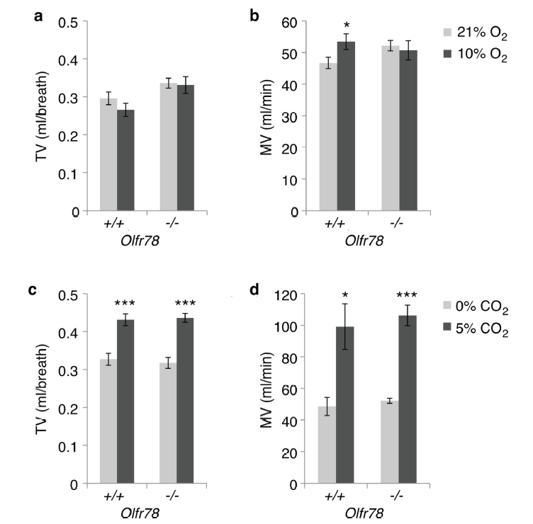 圖5、暴露于低氧和高二氧化碳環(huán)境下的Olfr78?/?突變體的潮氣量和分鐘通氣量。未束縛、未麻醉的Olfr78+/+對照組和Olfr78?/?突變體同窩仔鼠的全身體積描記。a、b)暴露于低氧環(huán)境下的動物的潮氣量(TV)和分鐘通氣量(MV)。n=9(+/+),8(?/?)只動物。c、d)暴露于高二氧化碳環(huán)境下的動物的潮氣量和分鐘通氣量。n=4(+/+),5(?/?)只動物。