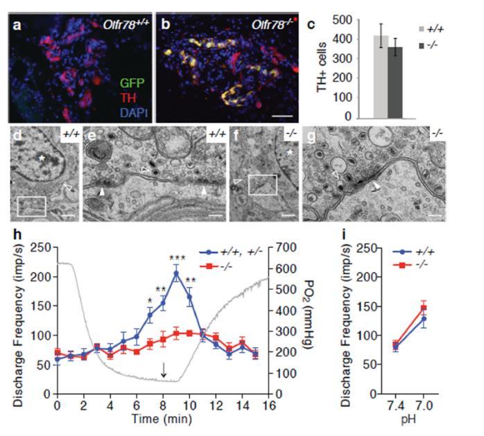 圖3、Olfr78介導(dǎo)頸動脈體氧感受。a,b.Olfr78+/+與Olfr78-/-CB切片:GFP(綠)、TH(紅)、DAPI(藍(lán))。突變體結(jié)構(gòu)正常。c.CB中TH陽性細(xì)胞計數(shù)。d–g.透射電鏡:野生型與突變型球細(xì)胞均含大核(*)、大致密芯囊泡(空箭頭)及小清芯突觸囊泡(實箭頭)。h,i.以竇神經(jīng)放電頻率評估CB對缺氧(h)及低pH(i)的反應(yīng)?;揖€示灌流液PO?時間曲線