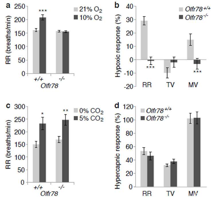 圖2、Olfr78缺失小鼠對缺氧及高碳酸的通氣反應(yīng)。通過全身體積描記法測定清醒、自由活動Olfr78+/+與Olfr78-/-同窩鼠的呼吸頻率(RR)、潮氣量(TV)及分鐘通氣量(MV=RR×TV)。a,b.缺氧(10%O?)刺激下的RR(a)及缺氧反應(yīng)百分比變化(b)。c,d.高碳酸(5%CO?)刺激下的RR(c)及高碳酸反應(yīng)百分比變化(d)