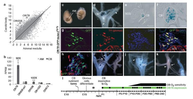 圖1、Olfr78在頸動脈體球細(xì)胞中的表達(dá)。a.通過RNA測序比較成年小鼠頸動脈體(CB)與腎上腺髓質(zhì)(AM)中26,728個基因的表達(dá)水平。以每10^7條比對reads的對數(shù)(log2)表示。b.在CB和/或AM中高表達(dá)的嗅覺受體(OR)基因;X表示CB相對于AM的富集倍數(shù)。c–f.Olfr78敲入報告小鼠(Olfr78-GFPtaulacZ)的X-gal染色(藍(lán)色,β-半乳糖苷酶活性)。c.腎上腺,未見報告基因表達(dá)。d.頸動脈分叉背面觀,可見CB(虛線圈)及偶見血管(箭頭)e,f.頸動脈分叉橫切面及局部放大。g,h.CB切片免疫染色:Olfr78報告基因(GFP,綠色)與球細(xì)胞標(biāo)志物酪氨酸羥化酶(TH,紅色)共定位;不與內(nèi)皮標(biāo)志物CD31(紅色)共定位。DAPI染核(藍(lán)色)。i–k.頸動脈分叉腹面觀X-gal染色:i.CB(虛線圈)由竇神經(jīng)(實心箭頭)支配,后者為舌咽神經(jīng)(空心箭頭)分支。j.異位“微球體”(MG)同樣受舌咽神經(jīng)支配。k.巖神經(jīng)節(jié)(箭頭)、結(jié)狀/頸靜脈神經(jīng)節(jié)(箭頭)均無報告基因表達(dá)。l.Olfr78報告基因在CB發(fā)育過程中的表達(dá)時間軸:實心圓=強表達(dá);空心圓=未檢出。