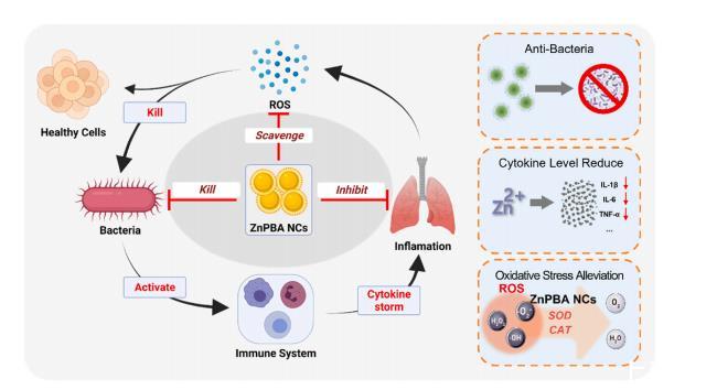 細(xì)菌性肺炎已被證實會導(dǎo)致急性和嚴(yán)重的病理性肺損傷,以及無法控制的氧化細(xì)胞因子風(fēng)暴。針對細(xì)菌性肺炎的有效療法要求高效清除病原體、緩解氧化應(yīng)激和抗炎。然而,目前的療法無法通過一種性能令人滿意的單一藥物來實現(xiàn)這些目標(biāo)。在此,我們報告了一種自組裝的普魯士藍(lán)類似物六氰基鐵酸鋅納米催化劑(ZnPBA NCs),它具有出色的廣譜抗菌活性,并對多種活性氧(ROS)和相關(guān)的細(xì)胞因子風(fēng)暴具有抗氧化催化活性。通過使用各種氧化物質(zhì)和體內(nèi)小鼠細(xì)菌性肺炎模型,我們驗證了合成的六氰合鐵酸鋅納米催化劑可以同時消除細(xì)菌感染,并在很大程度上緩解感染引起的氧化應(yīng)激和炎癥,這表明它在防治多種細(xì)菌感染相關(guān)疾病方面具有廣闊的臨床應(yīng)用前景。
