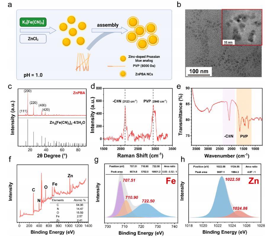 從傅立葉變換紅外光譜來看,1279cm處的峰值可歸因于C-N振蕩,而1660cm處的強(qiáng)峰值則表明吡咯烷酮環(huán)存在C-O伸縮振動(dòng)吸收。此外,在2103cm處可以觀察到強(qiáng)烈的紅外吸收,這是C-N鍵的特征(圖2e)。X射線光電子能譜(XPS)進(jìn)一步研究了ZnPBA NCs的化學(xué)成分和結(jié)合結(jié)構(gòu)。根據(jù)ZnPBA NCs的掃描光譜(圖2f),可以檢測到包括Zn、Fe、K、C、N和O在內(nèi)的主要元素,并對其原子濃度進(jìn)行了半定量測定,如圖2f插入的表格所示。為了進(jìn)一步研究鐵和鋅的價(jià)態(tài),還記錄了這些元素的高分辨率光譜。位于710.9eV和722.5eV的峰可以分配給Fe2p3/2和Fe2p1/2物種。在707.5eV的峰值顯示了Fe2+的存在,而在1022.6eV和1024.9eV的峰值對應(yīng)于二價(jià)鋅陽離子(圖2g-h),表明鋅離子為+2價(jià),而鐵離子為+2/+3混合價(jià)。上述光譜事實(shí)進(jìn)一步證實(shí)了氯化鋅、鐵氰化鉀和PVP聚合物成功地組裝到了ZnPBA NCs上,形成了Zn3[Fe(CN)6]2的一般組成。