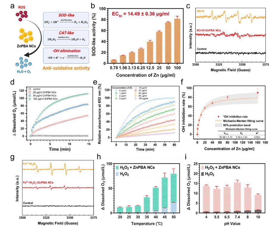 計(jì)算得出的-OH抑制率在ZnPBA NCs濃度為20μg/ml時(shí)達(dá)到57.19±3.69%,在濃度升至160μg/ml時(shí)進(jìn)一步提高到90.08±9.32%(圖3f)。接下來,我們利用EPR光譜鑒定了DMPO捕集劑存在時(shí)的-OH清除性能。在弱酸性環(huán)境下,可以觀察到FeSO4(20μM)和H2O2(2.5mM)之間的Fenton反應(yīng)產(chǎn)生的-OH光譜信號(hào)(振幅為1:2:2:1)。加入ZnPBA NCs(100μg/ml)可有效減弱-OH的光譜信號(hào),驗(yàn)證了ZnPBA NCs強(qiáng)大的-OH清除能力(圖3g)。通過檢測ZnPBA NCs與H2O2反應(yīng)過程中的溶解氧濃度,ZnPBA NCs在不同溫度(20?C至50?C)和pH值(4.0至10.0)條件下均表現(xiàn)出較高的CAT模擬活性。溫度的升高在很大程度上加速了H2O2(含或不含ZnPBA NCs)的分解(圖3h和i)。上述結(jié)果證明,ZnPBA NCs在溫度、pH值和底物濃度范圍較寬的條件下對ROS具有穩(wěn)定高效的抗氧化催化活性。