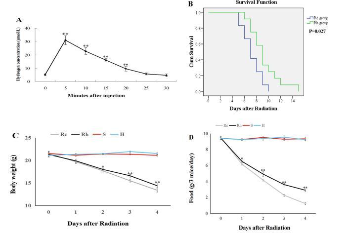 圖1:小鼠暴露于致死劑量全身輻射(WR)后的氫濃度與體重(BW)、食物攝入量和存活率。(A)施用Hs后腸粘膜氫含量的時間變化。(B)兩組小鼠在服用致死劑量WR后15天內(nèi)全部死亡。然而,氫氣明顯延遲了小鼠的死亡時間。(C)所有小鼠在WR后體重都急劇下降,而Rh組的體重總是明顯高于Rc組。(D)監(jiān)測三只小鼠全天的進(jìn)食量,數(shù)據(jù)以克/3只小鼠/天表示。在服用致死劑量的WR后,食物攝入量持續(xù)減少;然而,Rh組的食物攝入量遠(yuǎn)遠(yuǎn)高于Rc組在相應(yīng)日期的食物攝入量。