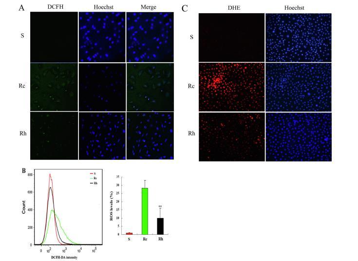 為了確定氫作為自由基清除劑的能力,我們通過兩種熒光探針比較了IEC-6細(xì)胞受到輻射后ROS的形成:DCFH-DA和DHE。一旦細(xì)胞用DCFH-DA染色,ROS形成的細(xì)胞表現(xiàn)出綠色熒光。在我們的研究中,用氫處理的細(xì)胞顯示出較低水平的綠色熒光密度(圖4A)。此外,我們還通過流式細(xì)胞術(shù)對ROS水平進(jìn)行了量化。我們的數(shù)據(jù)顯示,氫處理明顯抑制了ROS形成的瞬時增加(圖4B)。
