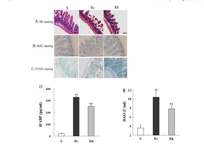 Rc組小鼠出現(xiàn)明顯水腫,隱窩明顯消失,絨毛明顯縮短。然而,Hs能明顯減輕亞致死劑量WR造成的損傷(圖2A)。