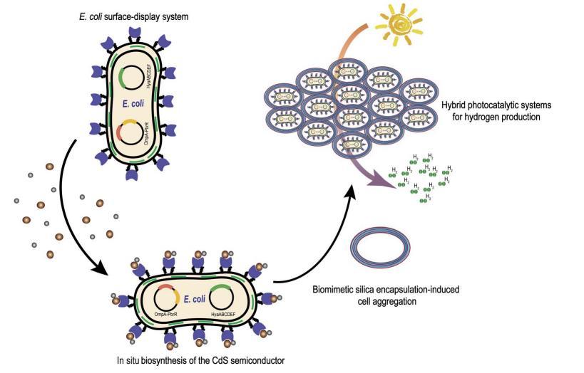 研究人員一直在努力優化混合系統,以保護催化活性免受氧應力的影響,從而克服這些限制。值得注意的是,Douglas等人報道了一種用于生產H2的智能自組裝生物分子催化劑,該催化劑利用噬菌體P22外殼蛋白來封裝和保護耐氧的[NiFe]氫化酶。同時,受仿生礦化的啟發,Tang等人開發了一種強大的硅化誘導綠藻系統,用于在有氧條件下可持續地生產光生物H2。受這些開創性研究的啟發,我們建議開發一種理想的全細胞光催化制氫系統,該系統包含以下組成部分:(i)生物兼容的光收集無機半導體,(ii)作為生物催化劑的活性工程大腸桿菌細胞,(iii)保護反應不受氧氣影響的可靠外殼。在此,我們旨在開發工程大腸桿菌細胞,將CdS納米粒子的生物合成能力與表面顯示的重金屬結合蛋白和耐氧型[NiFe]氫化酶的生物催化結合起來。結合整個大腸桿菌細胞的仿生硅封裝,生物無機混合系統實現了有氧條件下的光催化制氫(圖1)。