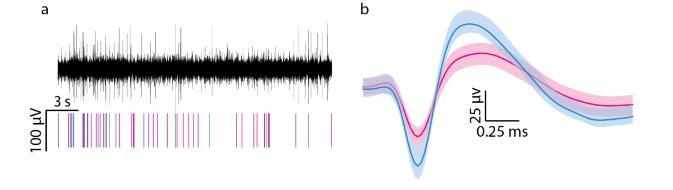 此圖顯示了一個具有代表性的濾波神經記錄、光柵圖以及與兩個單個單元相關的波形。(a)經過濾波的神經記錄以及顯示與兩個單個單元相關的脈沖活動的點陣圖,其中藍色和粉色分別代表這兩個單元。(b)從(a)所示的神經記錄中識別出的兩個單個單元,每個單元的平均波形以粗體顯示。