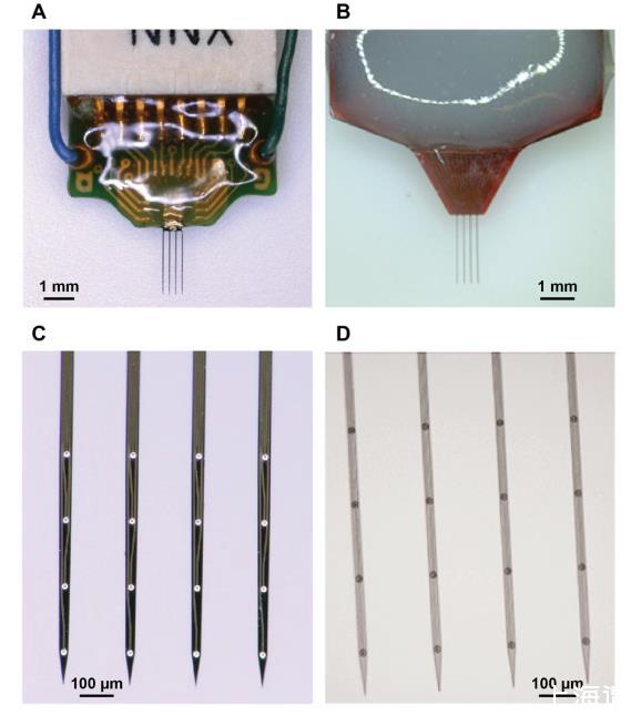 此圖顯示了本研究中使用的a-SiC微電極陣列和硅基微電極陣列。(A)硅基MEAs的圖像。(B)組裝好的a-SiC型MEAs的圖像。(C)硅基MEAs的支腳和電極位置的放大圖像。(D)a-SiC型MEAs的支腳和電極位置的放大圖像。將五只雌性Sprague-Dawley大鼠(美國馬薩諸塞州威爾明頓市Charles River實驗室)植入硅基MEAs,并與之前使用a-SiC MEAs(n=7)收集的數據進行比較。動物術后恢復7天后開始記錄數據。