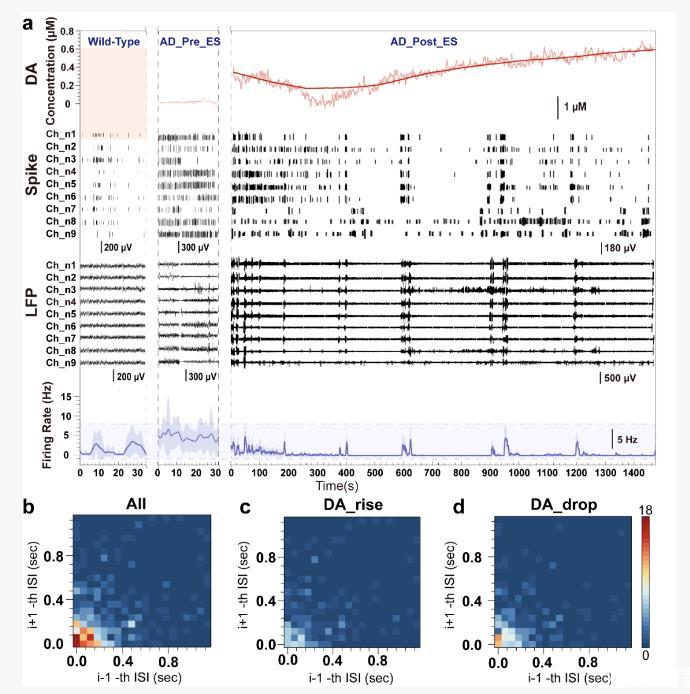 本研究通過(guò)NeuroRevive-FlexChip首次在阿爾茨海默病模型小鼠中實(shí)現(xiàn)了對(duì)多巴胺釋放、電生理活動(dòng)與電刺激效應(yīng)的多模態(tài)協(xié)同檢測(cè)與調(diào)控,系統(tǒng)揭示了40Hz電刺激誘導(dǎo)的神經(jīng)環(huán)路功能重塑機(jī)制。研究發(fā)現(xiàn),AD模型小鼠存在異常高頻放電與多巴胺水平下調(diào),40Hz刺激能夠有效提升多巴胺釋放、抑制異常同步放電,并伴隨行為改善與Aβ42負(fù)荷下降,構(gòu)建了從神經(jīng)活動(dòng)、神經(jīng)遞質(zhì)調(diào)控到病理緩解的完整干預(yù)鏈條。此外,研究表明神經(jīng)元放電模式的變化與多巴胺濃度動(dòng)態(tài)呈高度耦合關(guān)系,提示刺激頻率與內(nèi)源性神經(jīng)節(jié)律可能存在功能共振,為理解AD中神經(jīng)調(diào)控節(jié)律失衡提供了新視角。該研究不僅驗(yàn)證了40Hz神經(jīng)調(diào)控的可行性與多層效應(yīng),也為多巴胺系統(tǒng)在AD中的作用提供了直接電化學(xué)證據(jù)。
